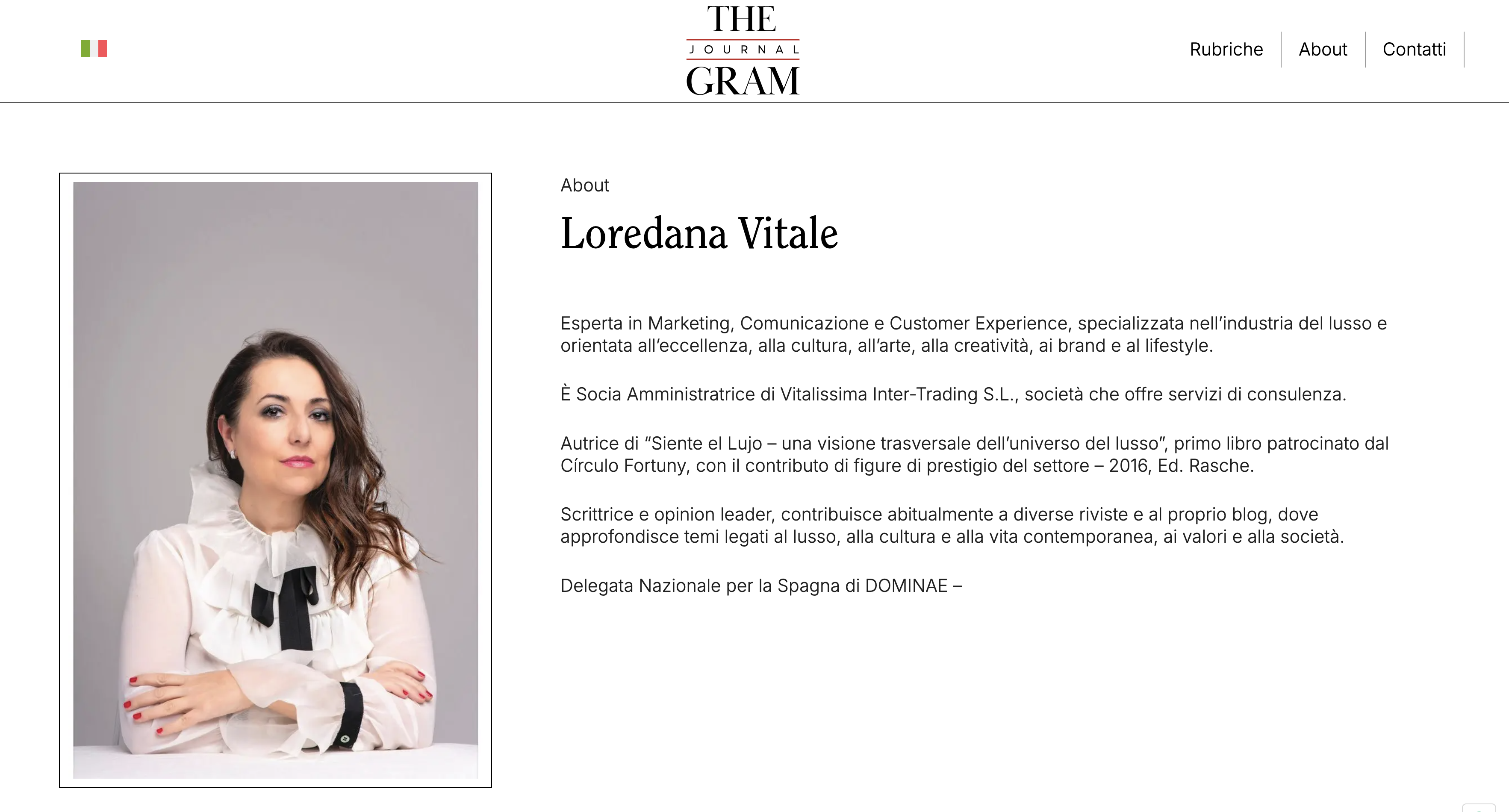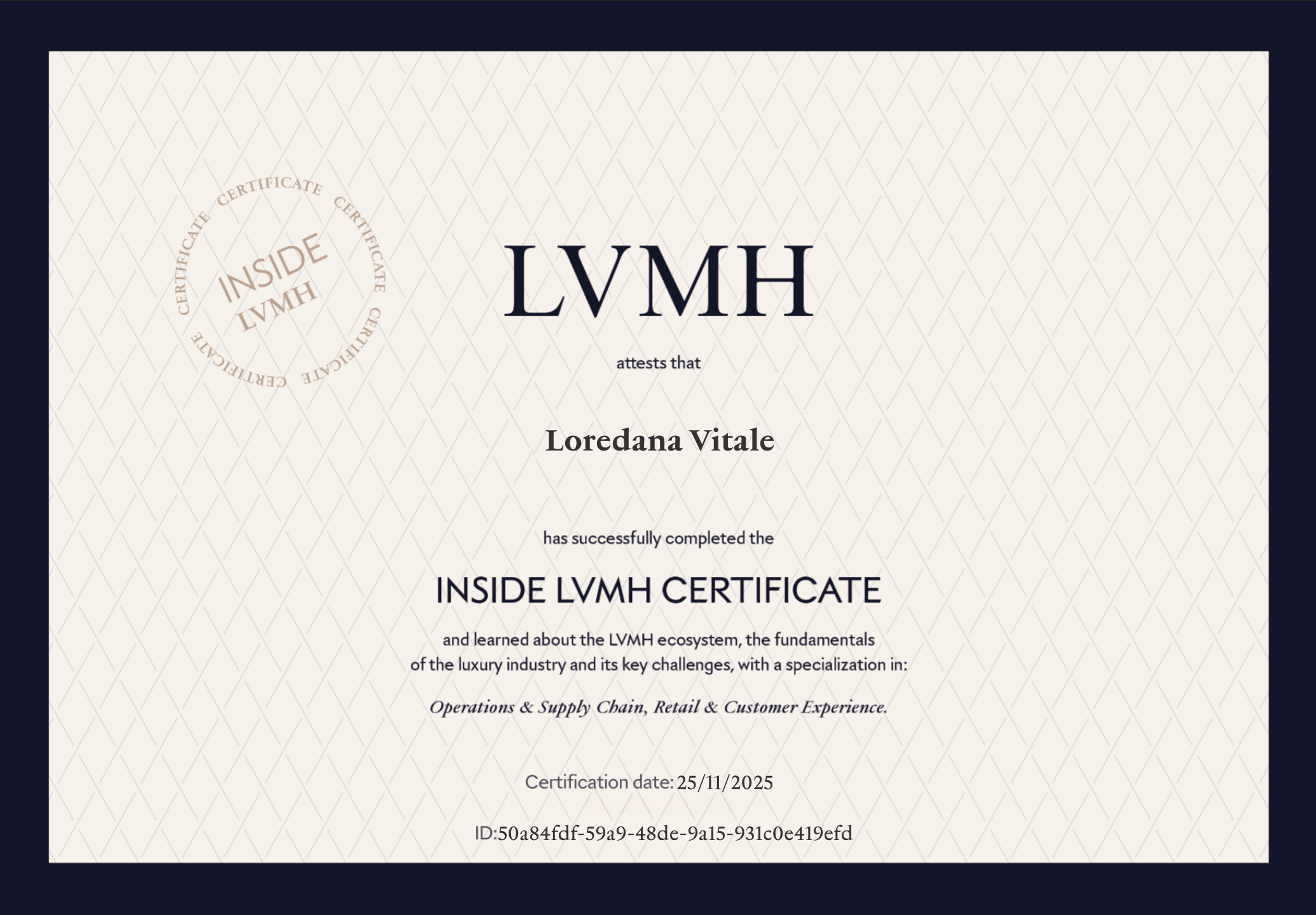 “Si hay una palabra que represente al universo del lujo, esa palabra es «sensibilidad; y esa es, precisamente, la palabra que mejor define a Loredana Vitale. Porque «sensibilidad» son justamente el conjunto de cosas que marcan la diferencia: atención al detalle, orientación al cliente, capacidad de anticipación, sentido estético, en definitiva, gusto y clase por las cosas bien hechas”.