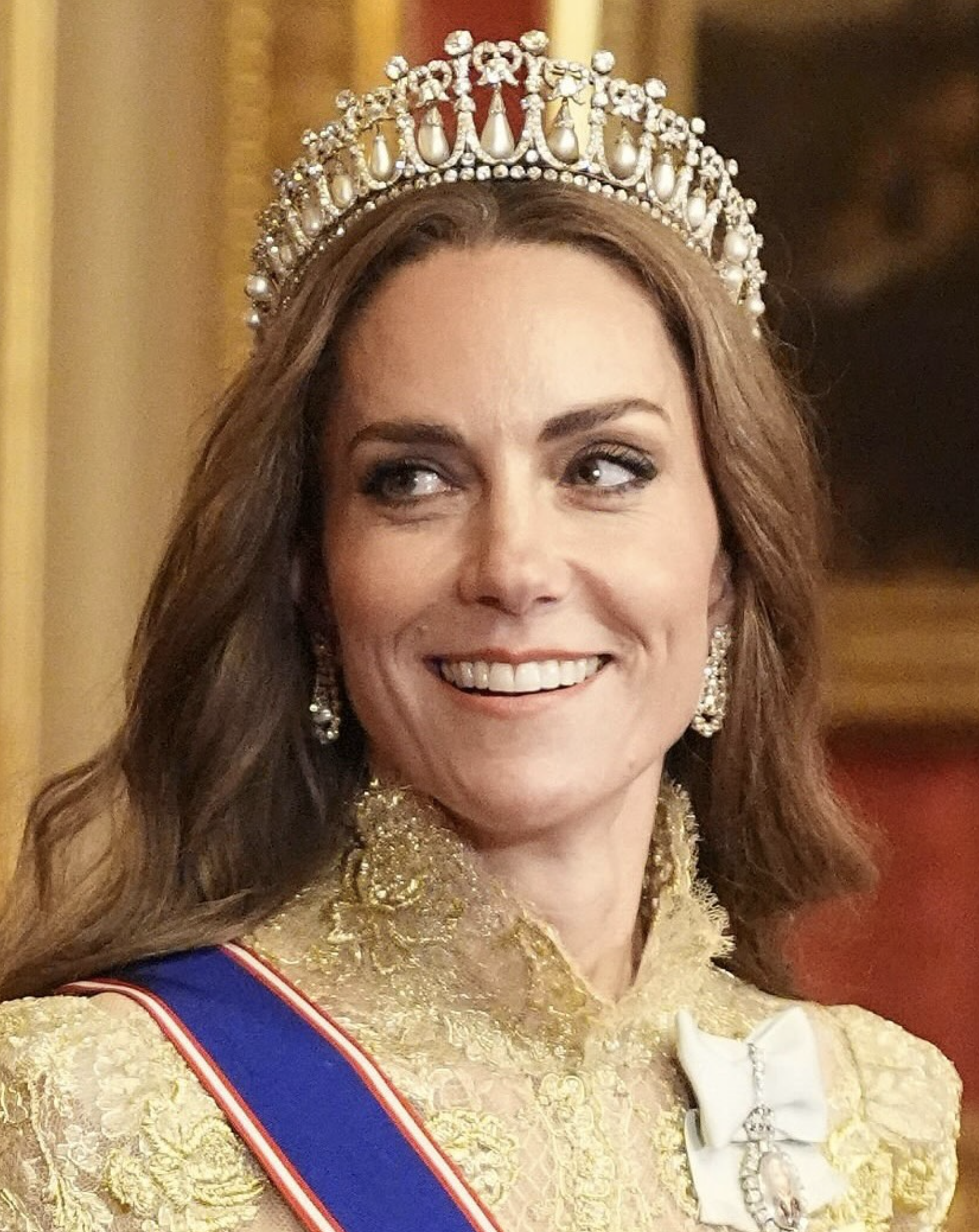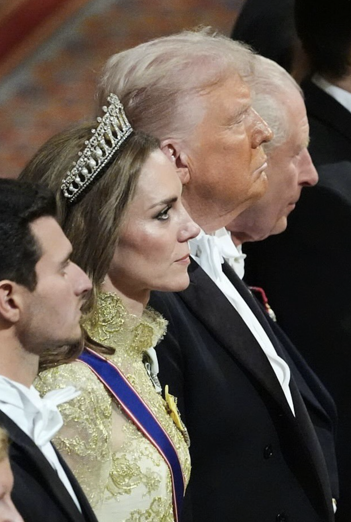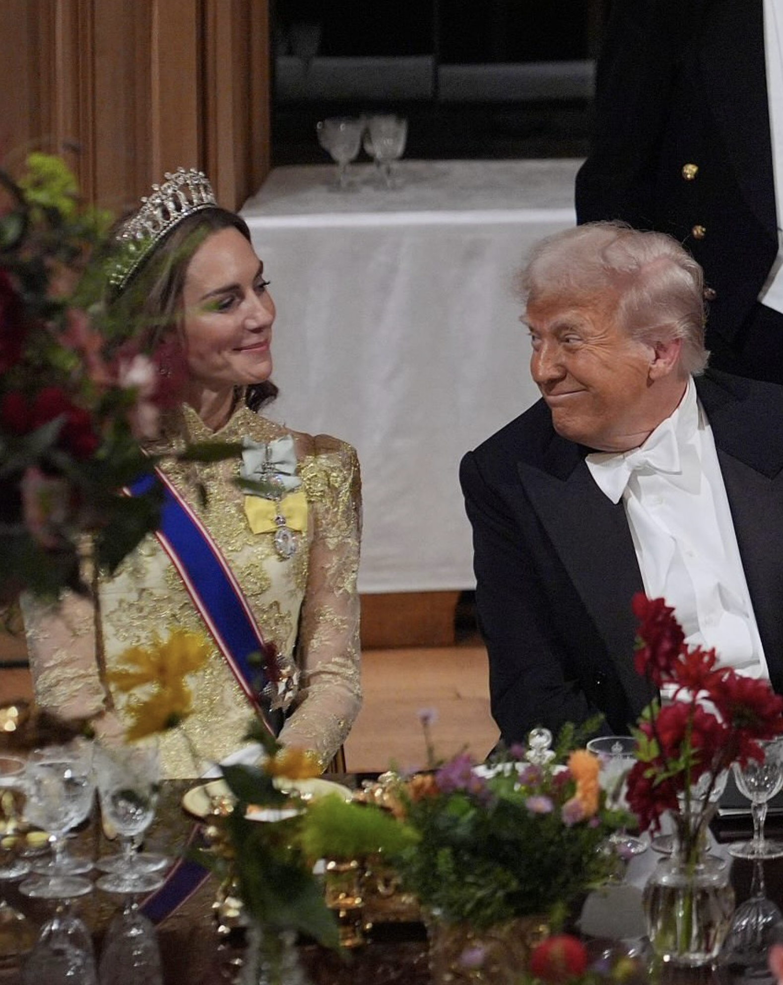L’etichetta vestiva anche i corpi. Codice white tie: frac e decorazioni per gli uomini; abiti lunghi, guanti e tiare per le donne. Kate apparve impeccabile: abito dorato di Phillipa Lepley, la tiara Lover’s Knot che fu di Lady Diana, la spilla con le piume del Galles. Tutto in ordine, tutto corretto. Ma il suo gesto fu un altro: i capelli sciolti in boccoli — insoliti per una cena di Stato — e un sorriso aperto che contrastava con la solennità della monarchia britannica. Quel cenno di libertà non incrinò il rituale, anzi: gli donò calore e umanità, senza stonare in alcun momento con la scena. Fu un equilibrio delicato, e forse per questo affascinò ancora di più Trump, che non nascose la sua ammirazione.