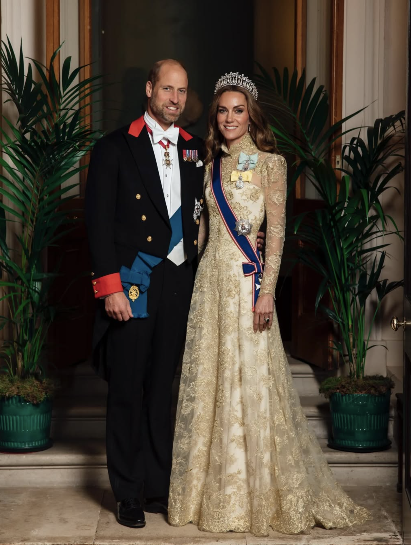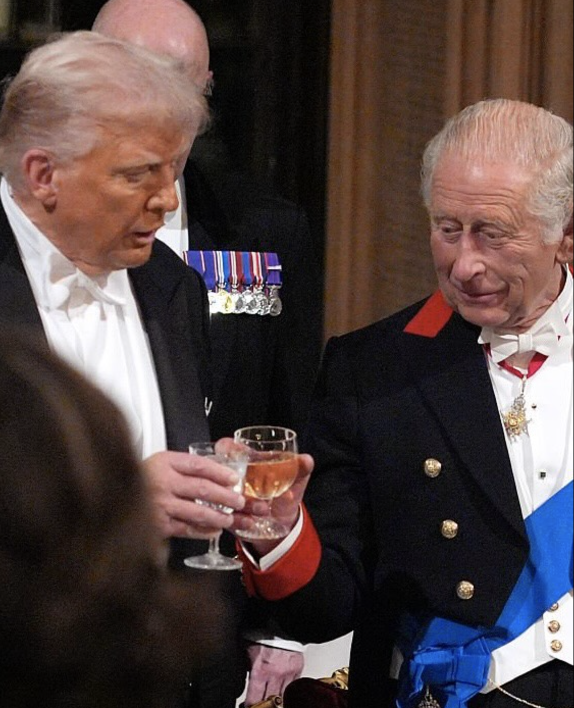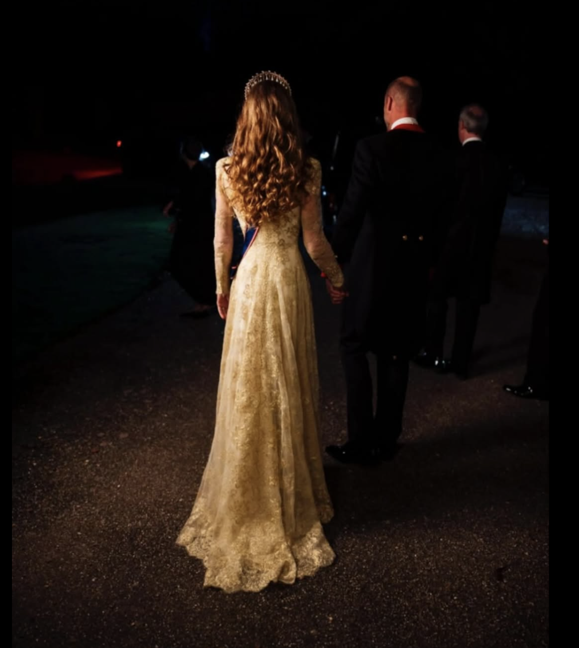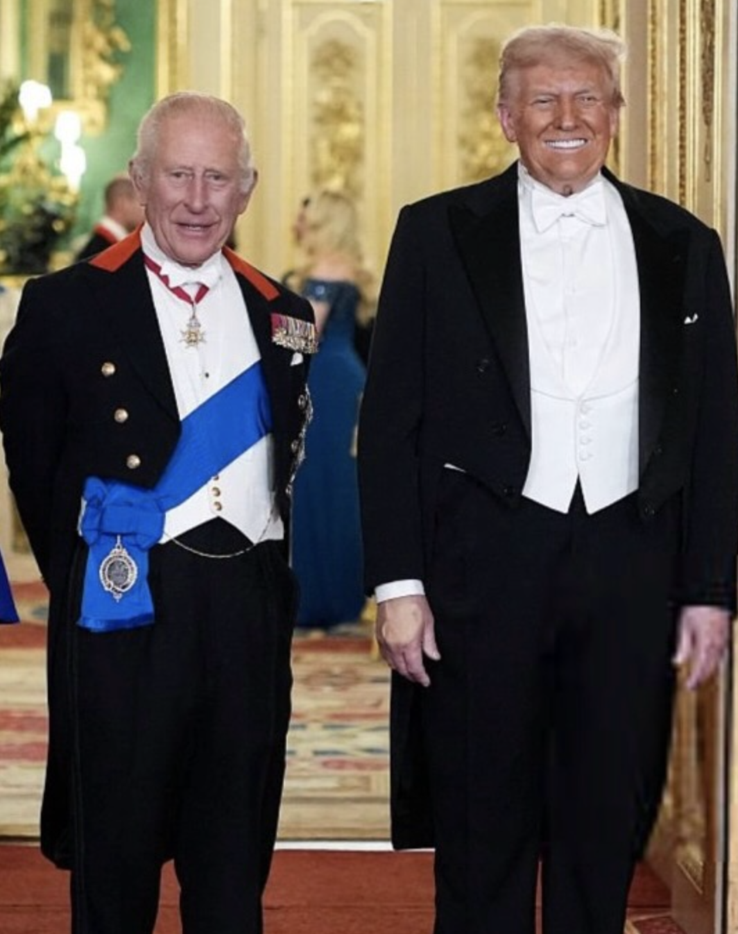 L’etichetta vestiva anche i corpi. Codice white tie: frac e decorazioni per gli uomini; abiti lunghi, guanti e tiare per le donne. Kate apparve impeccabile: abito dorato di Phillipa Lepley, la tiara Lover’s Knot che fu di Lady Diana, la spilla con le piume del Galles. Tutto in ordine, tutto corretto. Ma il suo gesto fu un altro: i capelli sciolti in boccoli — insoliti per una cena di Stato — e un sorriso aperto che contrastava con la solennità della monarchia britannica. Quel cenno di libertà non incrinò il rituale, anzi: gli donò calore e umanità, senza stonare in alcun momento con la scena. Fu un equilibrio delicato, e forse per questo affascinò ancora di più Trump, che non nascose la sua ammirazione.