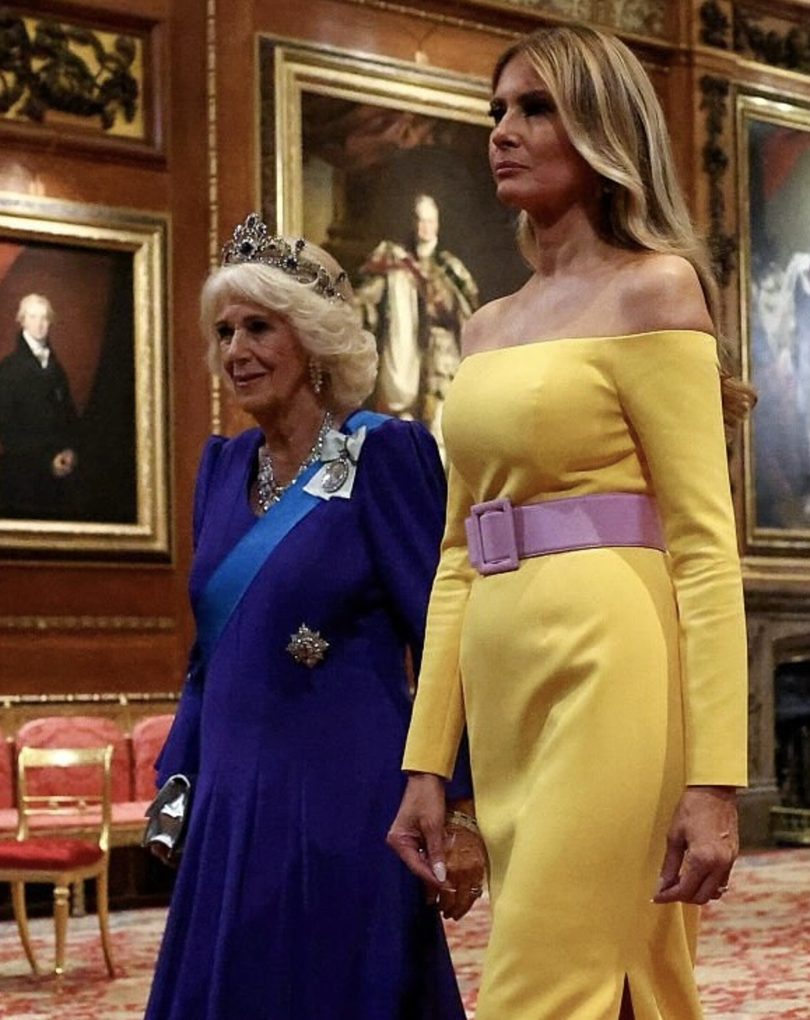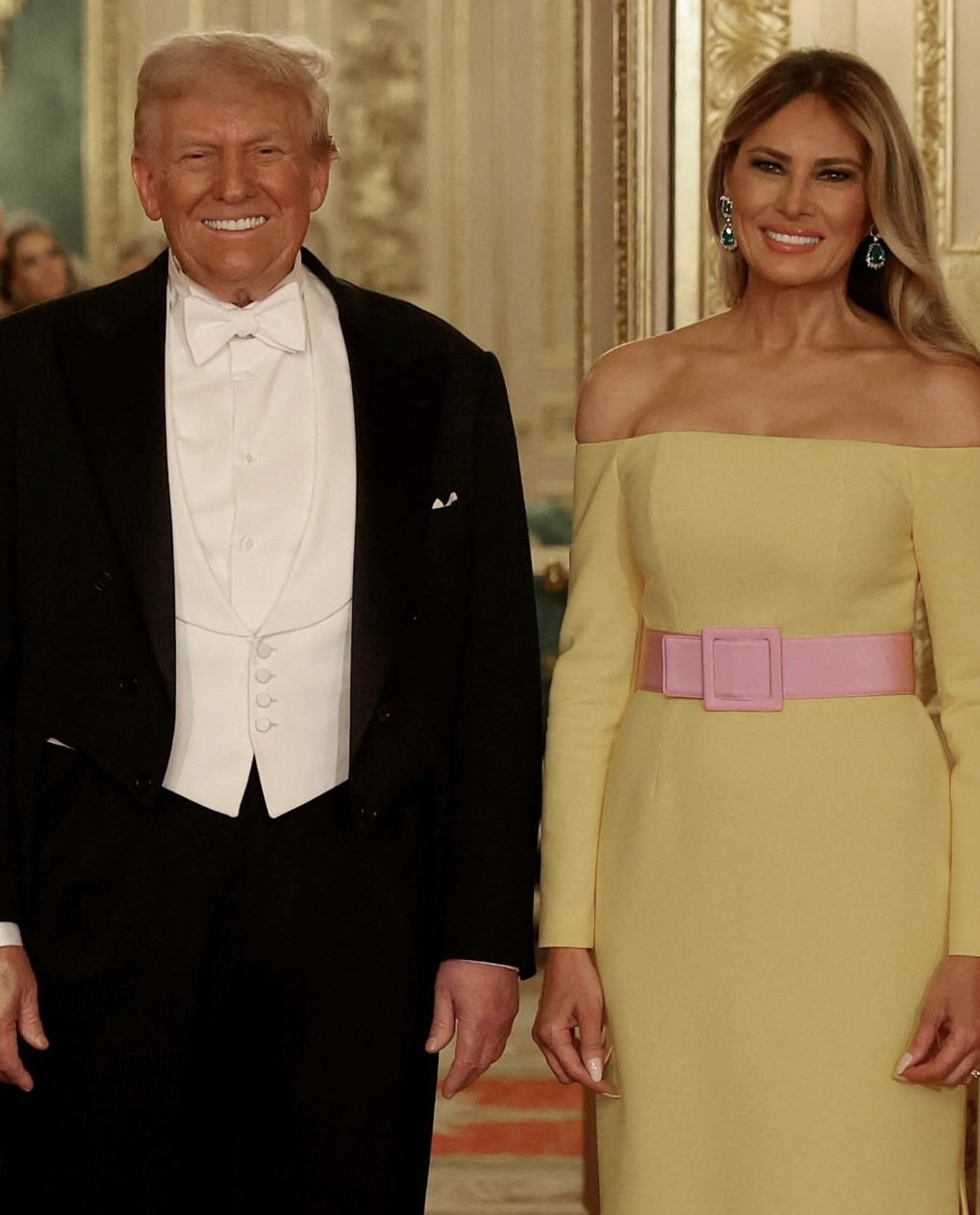 Melania, en cambio, no tuvo su mayor acierto. Eligió un vestido amarillo intenso de Carolina Herrera, de hombros descubiertos, demasiado moderno para una cena de Estado de estas características. Puede que buscara un guiño cromático alegre, recordando a la alegría de las vestimentas de Isabel II, pero el resultado se alejó de la solemnidad que ella misma ha sabido encarnar en otras ocasiones importantes. Esta vez parecía mal asesorada: no era un evento cualquiera, sino un encuentro con una de las monarquías más antiguas del mundo, donde cada gesto tiene peso histórico. Ese exceso contemporáneo terminó, a mi parecer, por restar en lugar de sumar.