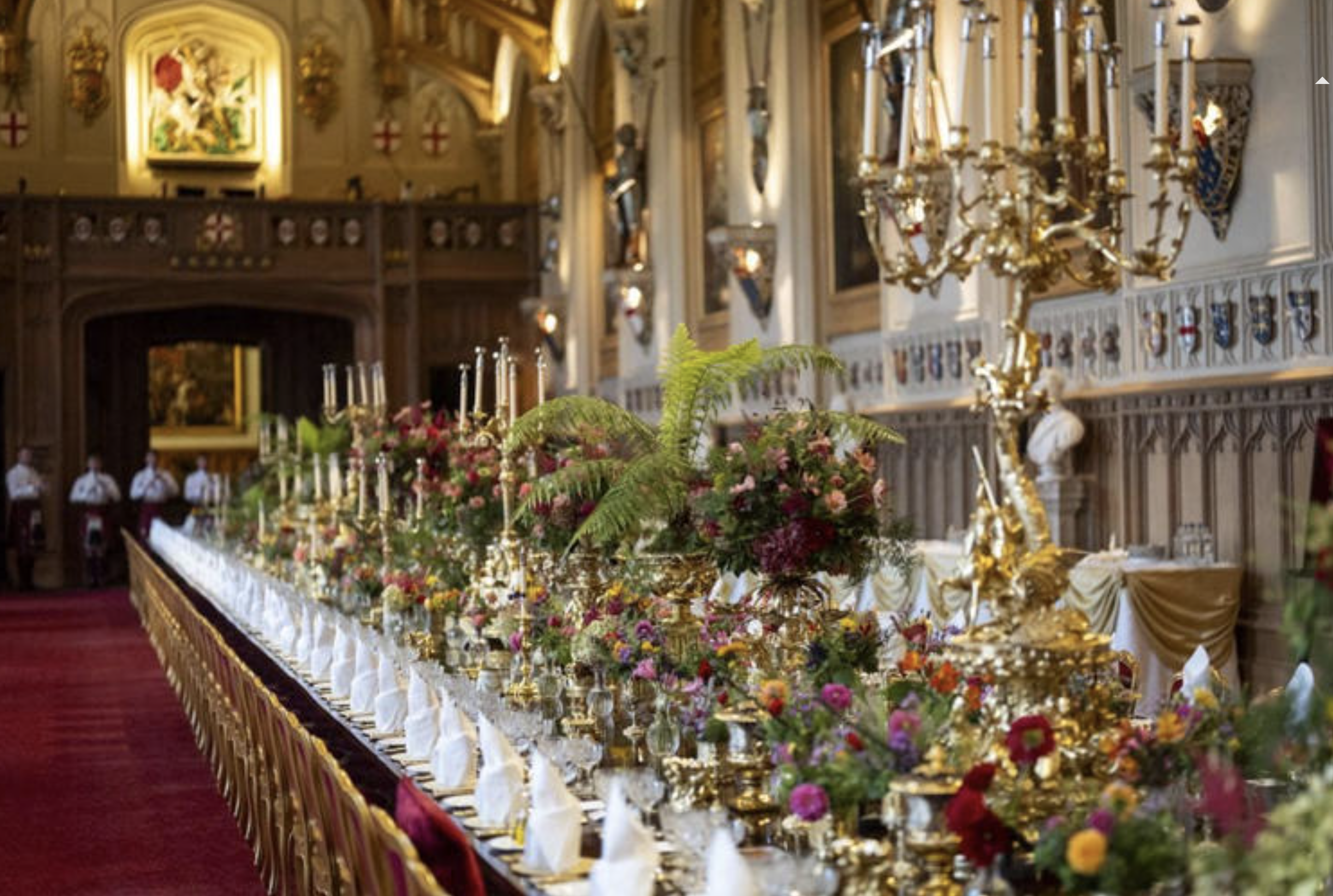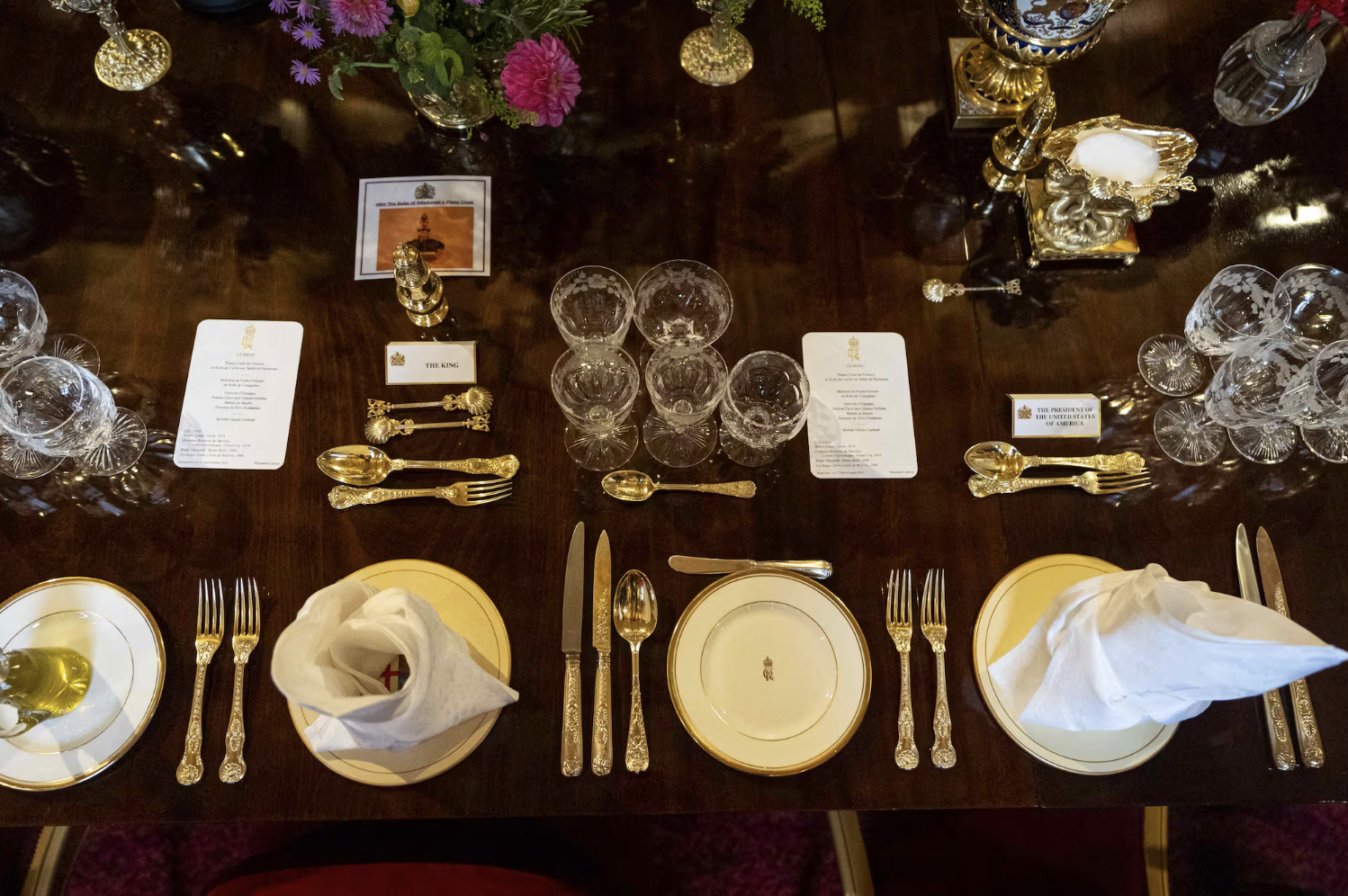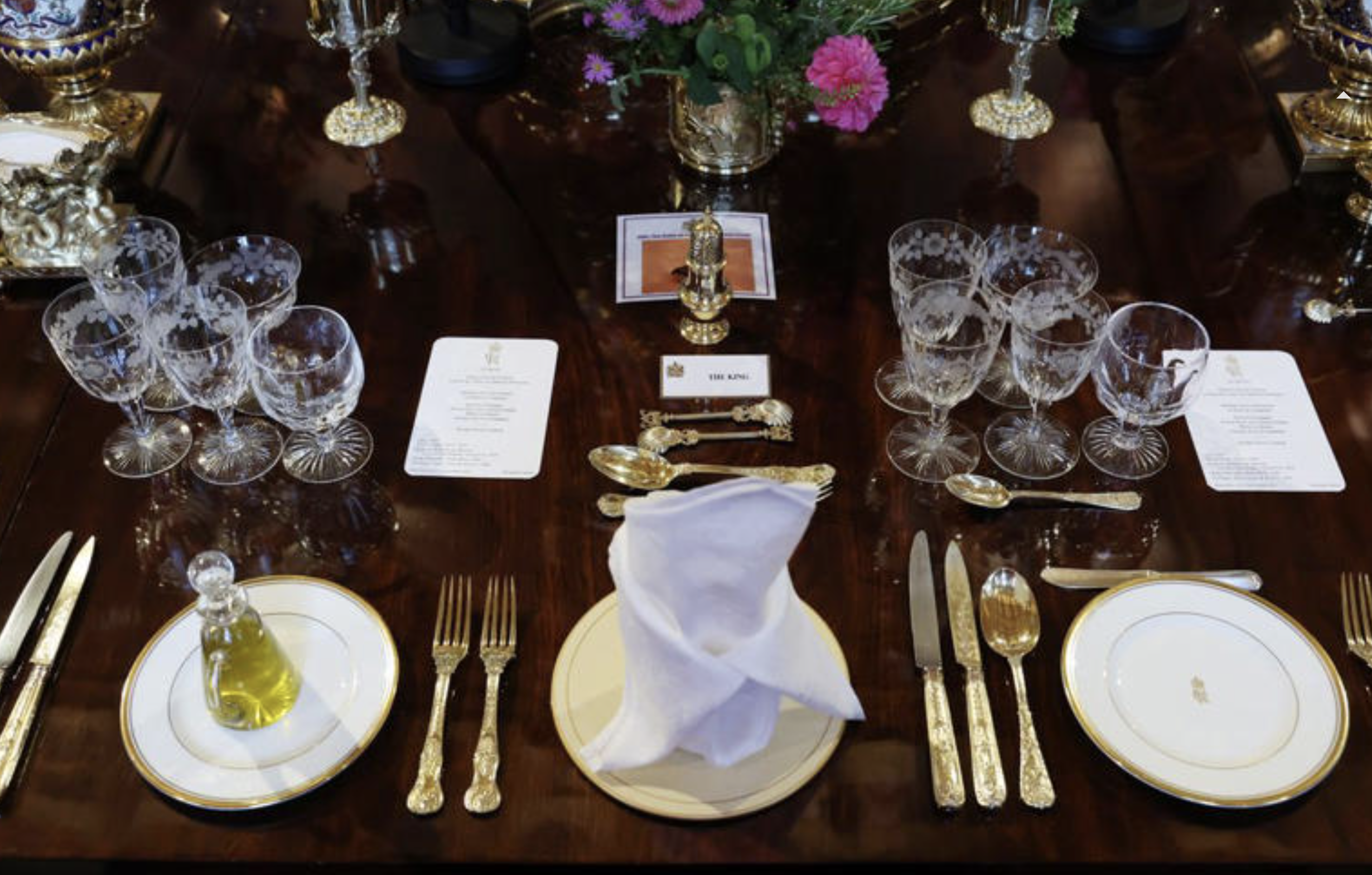 La scenografia della tavola non fu meno rivelatrice. Il Grand Service di Giorgio IV, con oltre quattromila pezzi di argento dorato, apparve in tutto il suo splendore. Non è un servizio qualunque: è l’affermazione di continuità monarchica, la prova tangibile che la Corona non improvvisa. Accanto, piatti nuovi fabbricati a Stoke-on-Trent per Carlo III, con un doppio filetto dorato sul bordo che li distingue dal servizio di Elisabetta II. Un dettaglio minimo, ma carico di significato: ogni regno lascia la sua impronta, persino nella porcellana. I bicchieri, lucidati fino a riflettere la sala come specchi, allineati con precisione matematica, trasformavano ogni bagliore in un atto di disciplina estetica.
